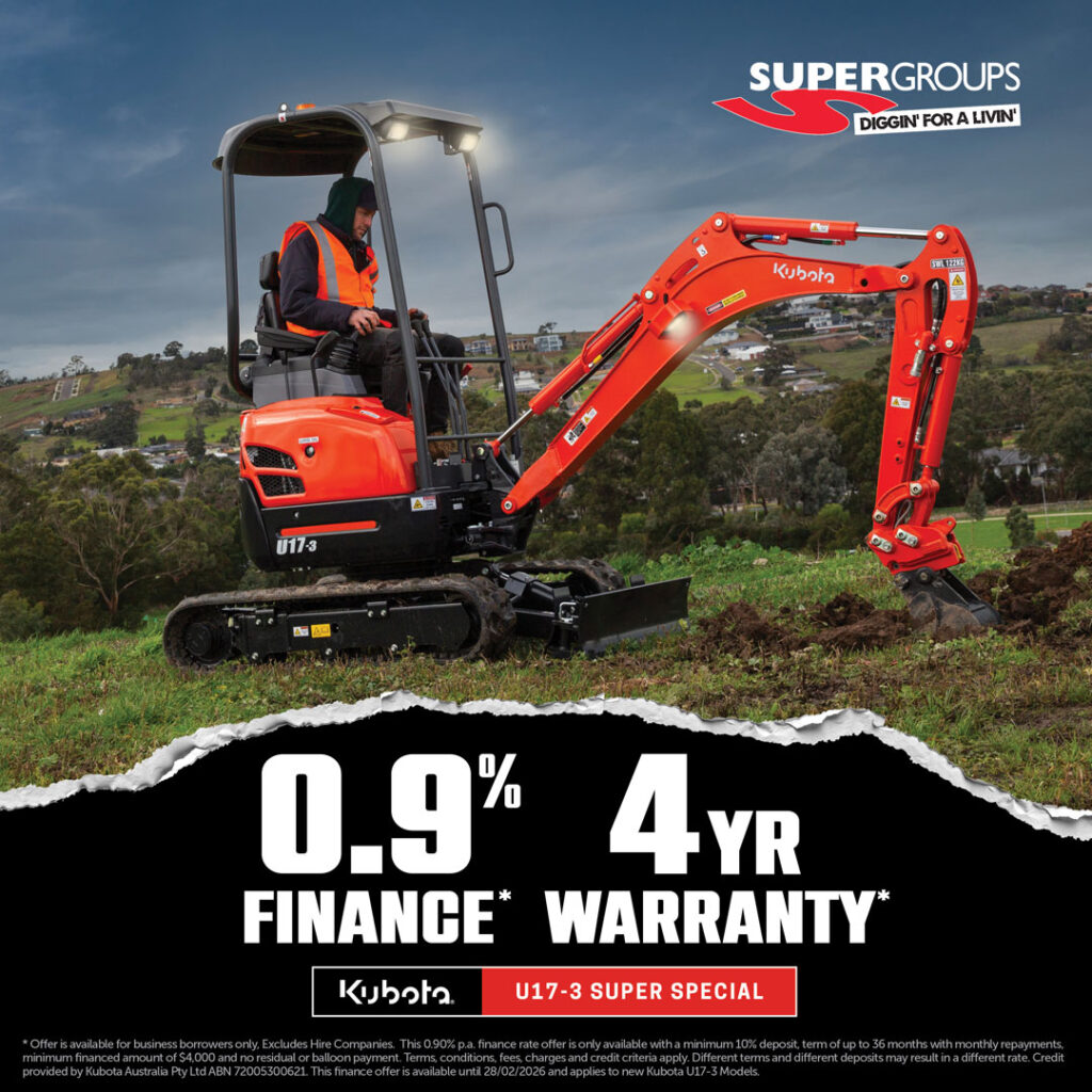 For a limited time, enjoy 0.9% finance plus a 4 year warranty on Kubota’s compact performer, built for tight access jobs without compromising power or reliability.
